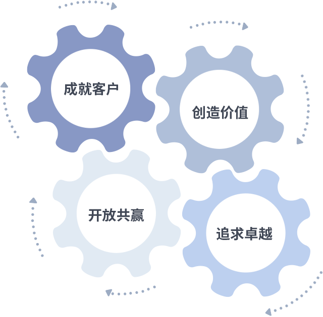 成就客户是一切决策的出发点,创造价值是衡量所有工作的标准,追求卓越是金百利做事做人的态度,开放共赢是金百利的格局也是最终的结果。价值观的齿轮环环相扣,推动着组织里的每个人不断向前。
